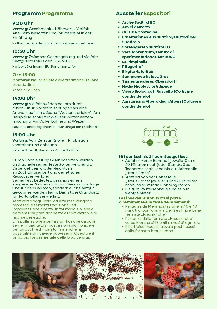 È previsto anche un programma di conferenze e tra i relatori spicca Herbert Dorfmann, parlamentario europeo. Il titolo della sua conferenza è “Tra legislazione e biodiversità, il seme nel centro della politica dell’UE”.