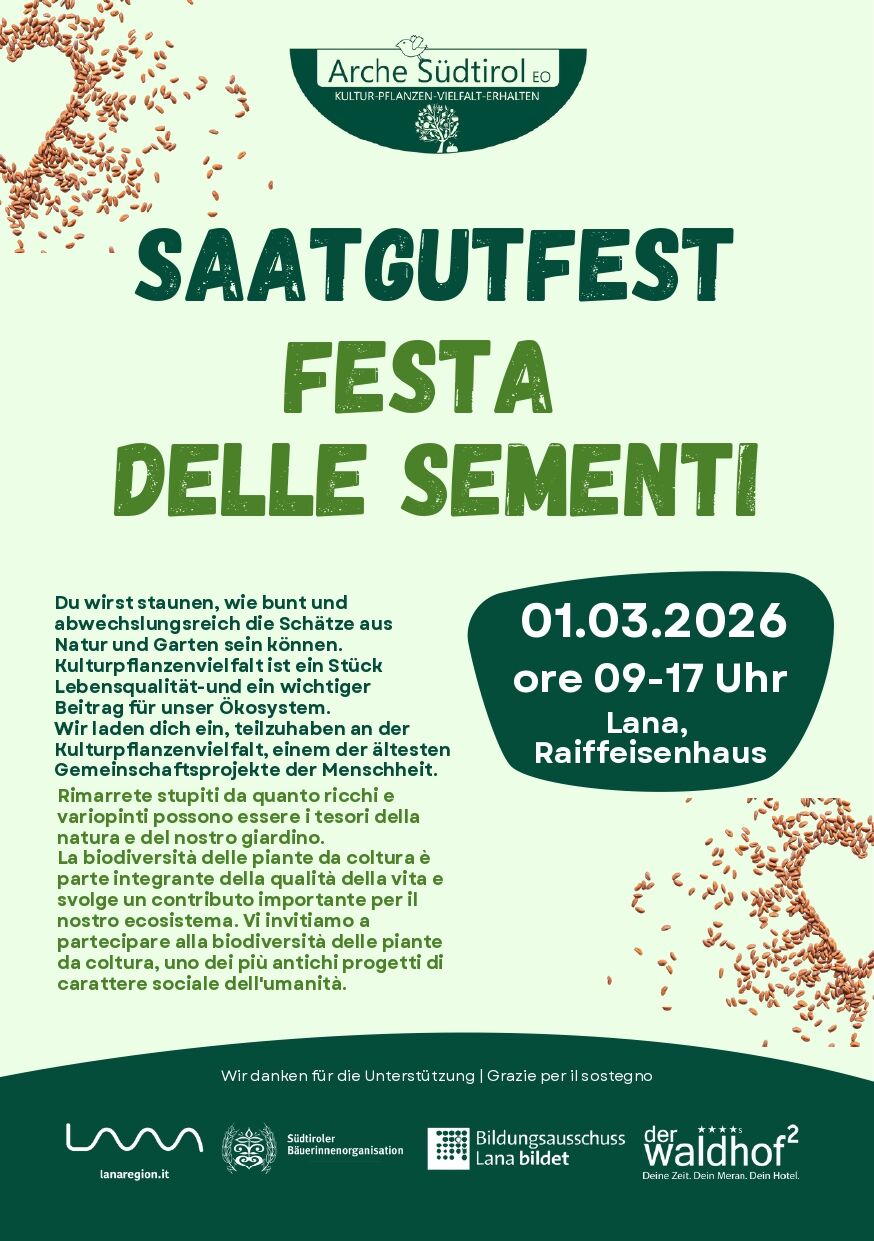 Anche quest’anno, domenica prossima, le Arche Südtirol – Artenvielfaltshöfe organizzano una festa delle sementi per “aumentare la consapevolezza sull’importanza della biodiversità delle piante da coltura”. Sarà nuovamente possibile scambiare o acquistare sementi.